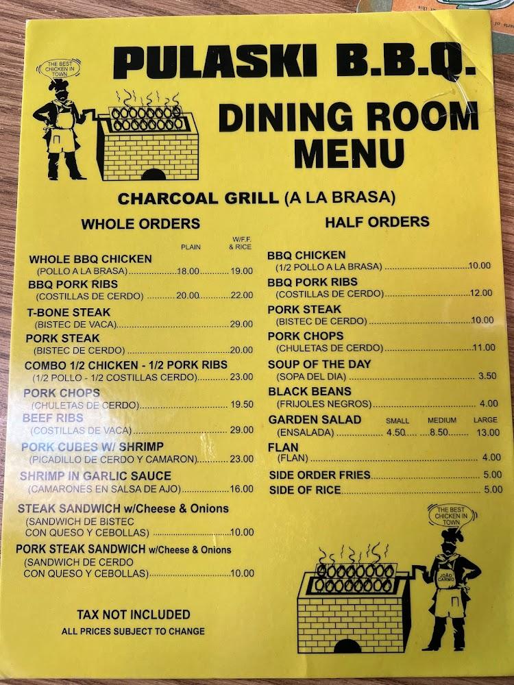 Pulaski BBQ's menu focuses on barbecue with a few traditional touches. Expect delicious whole and half orders of BBQ chicken, pork ribs, and steak. The ribs shine with their smoky flavors, perfectly seasoned and grilled to perfection.